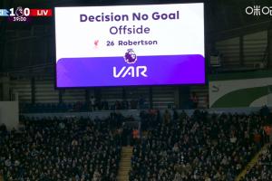 曼城3-0利物浦比赛的第38分钟,范戴克头球破门,但VAR判定罗伯逊越位位置干扰,进球被判无效。