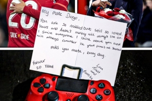 体育资讯11月4日讯 英格兰右后卫阿诺德本轮欧冠随皇马客战老东家利物浦,赛前,阿诺德在前队友若塔的纪念碑前留下卡片。