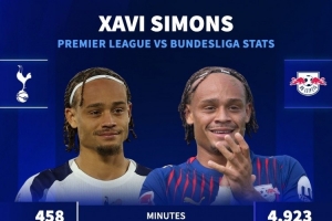 体育资讯11月4日讯 德国转会市场统计了热刺新援哈维-西蒙斯在德甲和英超的数据,并做出对比。