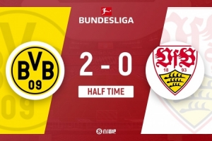 伤停补时3分钟。上半场比赛结束,多特2-0斯图加特。