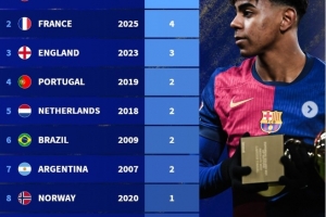 24直播11月05日讯 巴黎圣日耳曼小将杜埃荣膺2025年金童奖。德转统计显示,西班牙以5次获奖次数位居各国榜首,法国以4次次之,英格兰3次位列第三,葡萄牙、荷兰、巴西、阿根廷各两次,挪威、德国、意大利则各有一次获奖。