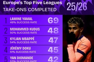 体育资讯12月18日讯 数据机构squawka统计了本赛季五大联赛成功过人情况,巴萨边锋亚马尔独自领跑。