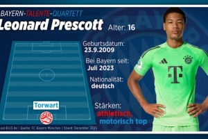 16岁门将莱昂纳德·普雷斯科特身高已达1.96米,比诺伊尔还高两厘米。他出生于纽约,但在柏林长大。2023年7月,他从柏林联合转会至拜仁,并凭借出色表现迅速接近一线队。这位年轻的门将已经开始与一线队的门将教练迈克尔·雷纳(45岁)和安德烈亚斯·罗塞尔(37岁)一起训练。