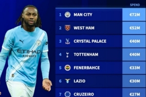 24直播01月19日讯 德转盘点了冬窗转会费支出榜单,曼城以7200万欧居首,西汉姆、水晶宫和热刺分别以5200万、4000万欧紧随其后。