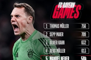 24直播01月19日讯 拜仁官方海报显示,门将诺伊尔以584次出场追平“足球皇帝”贝肯鲍尔,并列队史出场榜第五位。该榜单上,穆勒以756场居首,迈尔(709场)与卡恩(632分)分列二、三位。