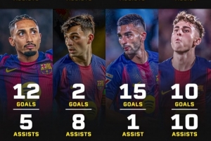体育资讯1月26日讯 西甲第21轮比赛,巴萨主场3-0完胜皇家奥维耶多。据媒体统计,巴萨队内8名球员本赛季参与进球10+。