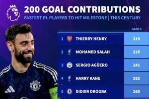 体育资讯1月26日讯 曼联在本轮英超3-2绝杀阿森纳,B费送出助攻,也达成了个人英超直接参与200球里程碑。数据统计显示,他也是新世纪第10快达成此成就的球员。