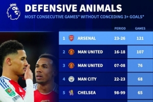 英超球队各项赛事连续“单场不丢3球”榜: