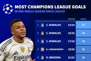 24直播01月29日讯 德国转会市场统计了欧冠改制以来单赛季进球榜。C罗以13-14赛季的17球高居榜首,并多次位列前五。本赛季,姆巴佩以13球与拉菲尼亚、吉拉西并列第七,展现了强大的得分能力。